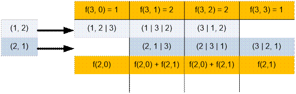 (1, 2) и будем вставлять 3 во все возможные позиции. Это значит, что f(2, 0) =