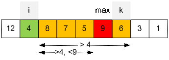 Для каждого индекса i находим максимальный индекс k (i k n), для которого RMinQ(si+1, …, sk) > si, бинарным поиском. Искомым j будет индекс, на котором достигается RMaxQ(si, …, sk) (i j k).