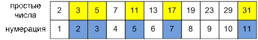 находящимися на простых позициях (2, 3, 5, 7, 11, …), будут 3, 5, 11, 17, 31, …