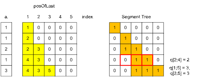 уменьшим b[posOfLast[ai]] на 1. Далее увеличим на 1 значение b[i] и установим posOfLast[ai] равным i.