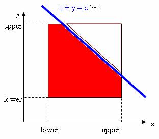 Определим случайную величину F(z) = {сумма двух прыжков не более z}. F(z) пропорционально площади области квадрата под прямой z = x