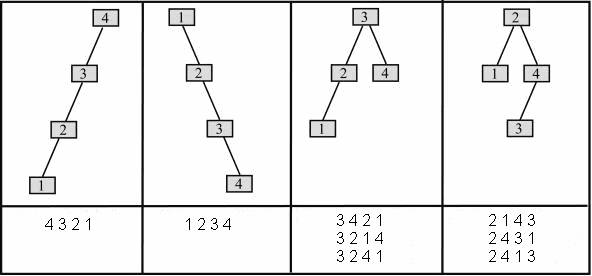 Ниже показаны деревья бинарного поиска с 4 вершинами, которые получены в результате вставки элементов порядке, приведенном под деревьями.