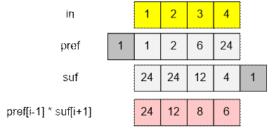 Array of prefixes pref, where pref[i] = in[1] * in[2] * … * in[i], we also set pref[0] = 1;
