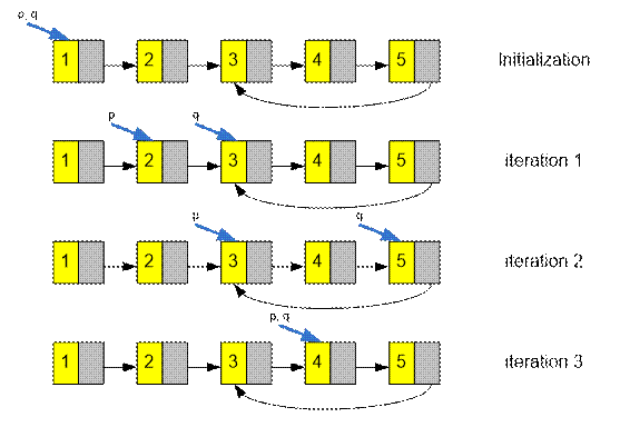 их на начало списка. Далее итеративно двигаем первый указатель p вперед на одну позицию по списку, а