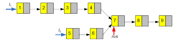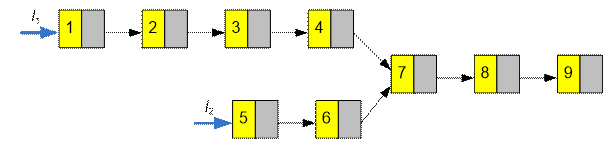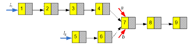 Установим указатели a = l1, b = l2. Двигаем указатель a на |7 – 5| = 2 позиций вперед.