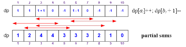 For each segment [ai, bi], perform the following two operations: dp[ai]++; dp[bi + 1]--.