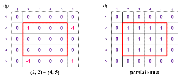 dp[x1][y1]++; dp[x1][y2 + 1]--; dp[x2 + 1][y1]--; dp[x2 + 1][y2 + 1]++;