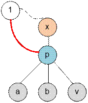 Edges will be added starting from vertex 1. Indeed, if an edge (u, v) is added, replacing it with (1, v) will not worsen the result. If the distance from 1 to v is greater than two, it makes sense to draw an edge from 1 to the ancestor of v. In this way, we’ll reduce to two the distance from 1 to all siblings of v (vertices are called siblings if they have a common immediate ancestor), as well as to the ancestor of the ancestor v – the vertex x.