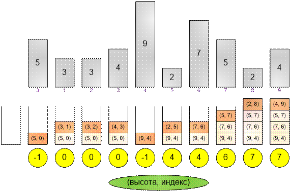 стек s для хранения высот и индексов солдат.