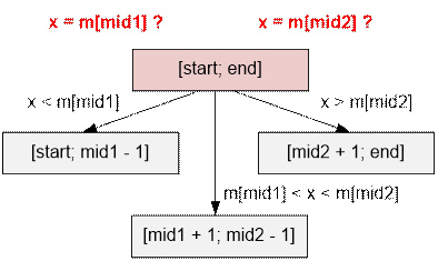 If x equals to m[mid1] or m[mid2], then number x is found, we return 1. Otherwise, depending on the following conditions, we