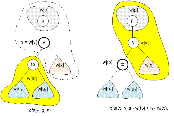 dfs2(to, v, s - weight[to] + n - weight[to]);