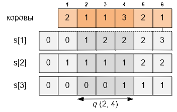 Количество коров породы 3 равно s[3][b] – s[3][a – 1];