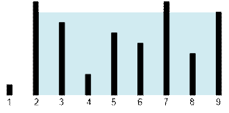 Наибольшее количество воды можно удержать между линиями 2 и 9. Высота уровня воды составит 7, а объем воды равен 7 * 7 = 49.