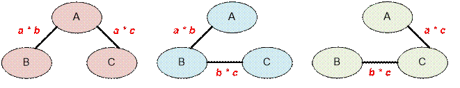 Если мы соединим ребрами компоненты A и B, а также A и C, то количество способов выбрать их равно a * b * a * c. Соответственно если два ребра проводятся между компонентами A и B, и B и C, то выбрать их можно a * b * b * c способами. Два ребра можно также провести между компонентами A и C, и B и C. Число способов выбрать два ребра таким образом равно a * b * c * c. Следовательно ответ равен
