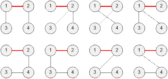 Рассмотрим первый тест. Построим все возможные остовные деревья с ребром (1, 2). Их количество равно 8.