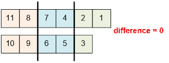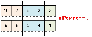 Output. In the first line, print two integers – the number of elements in the first and second groups.