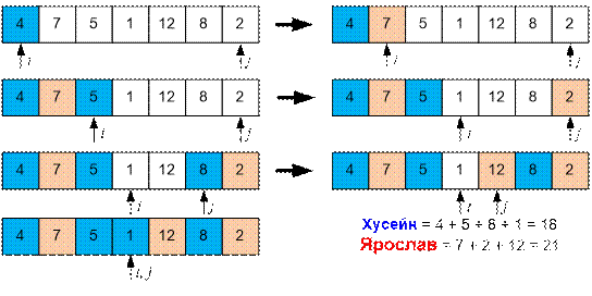 Объявим рабочие массивы. Сумму чисел на карточках Хусейна и Ярослава будем подсчитывать