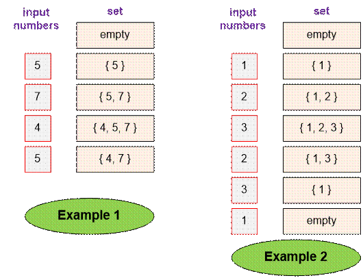 simulate how the set behaves for the first and second examples.