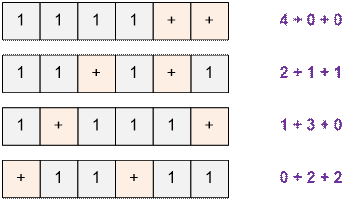 correspond to some solution of the given equation. For example, consider some solutions of the equation x1 + x2 + x3 = 4 (4 ones and 2 plus signs):