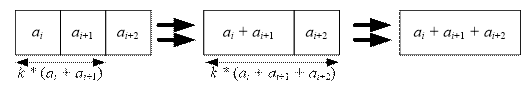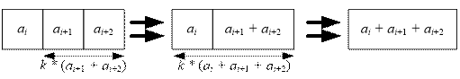 Объединить ai+1 и ai+2 за k * (ai+1 + ai+2), после чего объединить ai и ai+1 + ai+2 за k * (ai + ai+1 + ai+2).