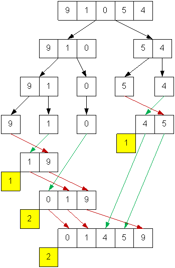 слияния, записано количество инверсий, которое образуют элементы сливаемых