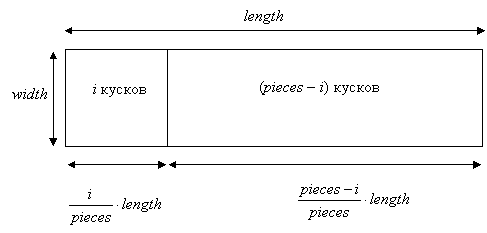 Благодаря верхнему ограничению на число кусков pieces, задача может быть просто решена полным перебором разрезаний торта. Если кусок размером length на width следует разбить на pieces кусков, то после совершения первого разреза (который по условию задачи можно совершить либо по горизонтали, либо по вертикали) площади двух полученных кусков должны быть пропорциональны числам 1 и pieces – 1, или 2 и pieces – 2 и так далее. То есть после первого разреза должны получаться два куска размером i * length / pieces на width и ((piecesi ) * length / pieces на width, или length на i * width / pieces и length на (piecesi) * width / pieces,  где 1 £ i < pieces. При этом дальше первый кусок следует делить на i кусков, а второй на piecesi кусков.
