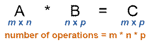 Число колонок в матрице A должно совпадать с числом строк матрицы B. Пусть матрица A имеет размер m × n, матрица B имеет размер n × p. Тогда матрица С будет иметь размер m × p, а для ее вычисления следует совершить m * n * p умножений.