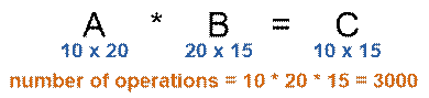 Например, если A имеет размер 10 × 20, B имеет размер 20 × 15, то необходимо совершить 10 × 20 × 15 = 3000 умножений для вычисления матрицы C.