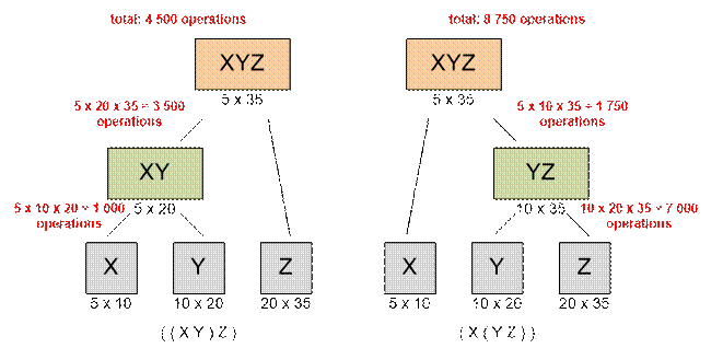 Перемножать несколько матриц можно несколькими способами. Например, если у нас имеются матрицы X, Y и Z, то вычислить XYZ можно либо как (XY)Z, либо как X(YZ). Пусть X имеет размер  5 × 10, Y имеет размер 10 × 20, Z имеет размер 20 × 35.