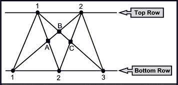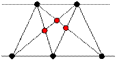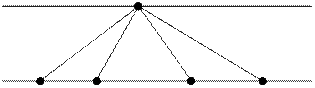 Имеются две строки. На верхней строке отмечено a точек, а на нижней b точек. Соединим отрезком каждую точку верхней строки с каждой точкой нижней строки. Точки расположены так, что количество точек, полученных в результате пересечения отрезков, максимально. Для достижения этой цели достаточно чтобы никакие три отрезка не пересекались в одной точке. Точки на верхней и нижней строках в подсчет не включаются, в них могут пересекаться любое количество отрезков. По значениям a и b Вам необходимо вычислить P(a, b) – максимальное количество точек пересечения, расположенное между двумя строками. Например, пусть a = 2 и b = 3. Из рисунка видно, что P(2, 3) = 3.