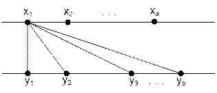 Рассмотрим общий случай. Пусть x1, x2, …, xa – точки на первой прямой,  y1, y2, …, yb – точки на второй прямой. Соединим точку x1 с точками y1, y2, …, yb. На отрезке x1y1 точек пересечения не будет. На отрезке x1y2 будут лежать точки пересечения с отрезками y1x2, y1x3, …, y1xa (всего a – 1 точек). На отрезке x1yj будут лежать точки пересечения с отрезками yixk, где i < j, 2 £ k £ a (всего (j – 1) * (a – 1) точек). Количество точек пересечения, которые лежат на отрезках исходящих из x1, равно (0 + 1 + 2 + … + (b – 1)) * (a – 1) = b * (b – 1) / 2 * (a – 1).