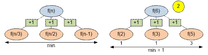 f(n) = min(f(n – 1), f(n / 2), f(n / 3)) + 1,