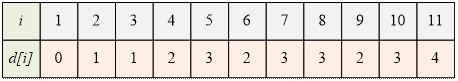d[10] = min(d[9], d[5]) + 1 = min(2, 3) + 1 = 3