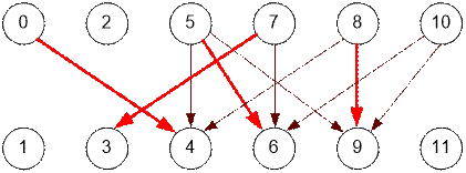примет следующий вид. Максимальное паросочетание равно 4. Его образуют ребра 0 → 4, 5 → 6, 7