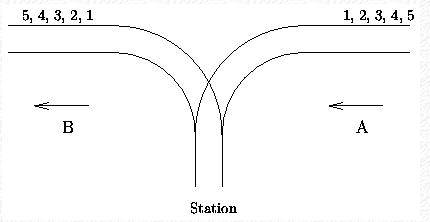 Вагоны, которые будут заезжать на станцию-тупик, будем хранить в стеке s. На стороне А вагоны находятся в последовательности 1, 2, ..., n. Если первым на стороне B должен быть вагон k, то этого можно достичь загнав в тупик все вагоны с номерами 1, 2, ..., k, после чего перегнав вагон с номером k на сторону B.