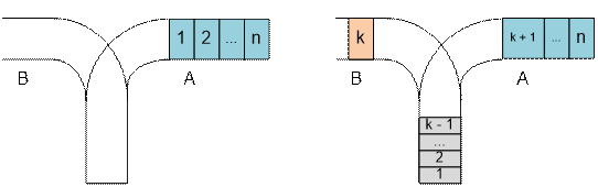 Пусть после этого вторым на стороне B должен находиться вагон с номером l. Если l < k, то его можно перевезти в направлении B только если он на данный момент находится на вершине стека s (иначе требуемая перестановка вагонов неосуществима). Если l > k, то перегоняем со стороны А все вагоны вплоть до l-го в стек, после чего перевозим вагон l на сторону B. Продолжаем моделировать перевозку вагонов указанным образом, пока все вагоны не будут перевезены со стороны А в сторону B.