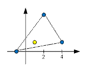 В первом тесте точка (1, 1) лежит внутри треугольника.