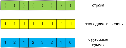 Рассмотрим скобочную структуру. Каждой открывающейся скобке поставим в соответствие число 1, закрывающейся -1. Вычислим частичные суммы полученной последовательности.