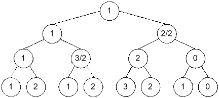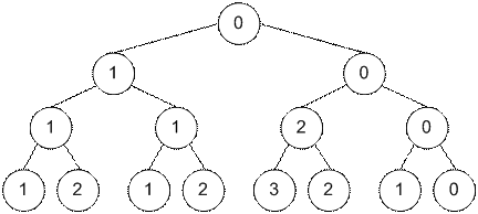 Рассмотрим строку ”(()(()))”. Построим дерево отрезков из соответствующих ей частичных сумм {1, 2, 1, 2, 3, 2, 1, 0}. В вершинах указаны значения переменных min. Изначально значения add во всех вершинах равны 0.