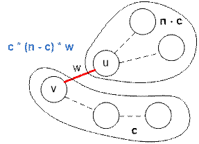 contains c vertices, and the other side contains n – c vertices. The edge (v, to) is included in c * (n – c) different paths between pairs of vertices. Thus, the