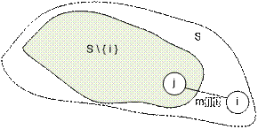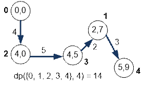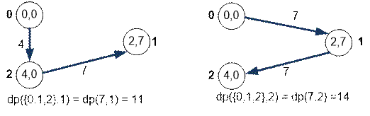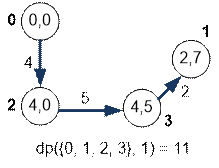 dp({0, 1, 2, 3}, 3) = min(dp({0, 1, 2}, 1) + m[1][3], dp({0, 1, 2}, 2) + m[2][3]) =