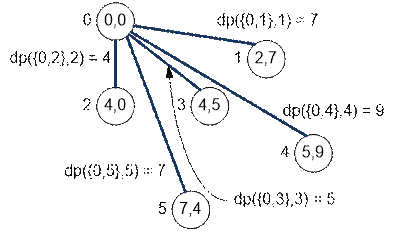 Для непустого подмножества S Í {1, 2, …, n} и каждой вершины i Î S определим dp(S, i) как длину кратчайшего пути, начинающегося в первой (начальной) вершине, проходящего по всем вершинам из множества S \ {i} в произвольном порядке и оканчивающегося в вершине i. Тогда имеют место равенства: