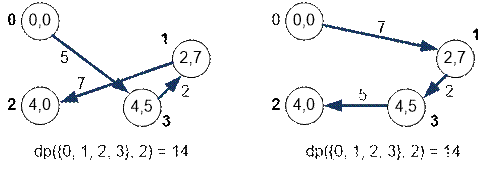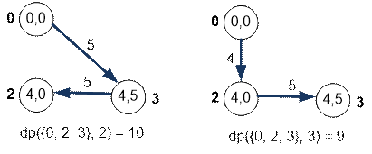 dp({0, 1, 2, 3}, 2) = min(dp({0, 1, 3}, 1) + m[1][2], dp({0, 1, 3}, 3) + m[3][2]) =