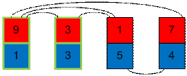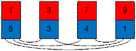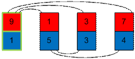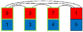 образуют 5 инверсий. Начнем сортировать карты по синим числам. Возьмем карту с