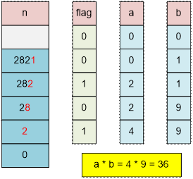 будет принимать попеременно значения 0 и 1. При flag = 1 последнюю цифру числа n прибавляем к a, при flag = 0 ее прибавляем к b. На каждой итерации делим n на 10 и