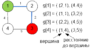 взвешенного графа. Каждый элемент g[i] является списком пар (вершина, расстояние).