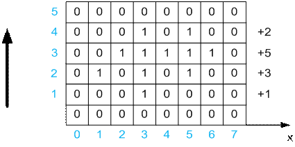 Например, рассмотрим горизонталь y = 2. На ней начинаются отрезки с