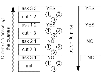 operations are performed, the set of edges is empty). To process the request “cut u v”, we will add an edge between