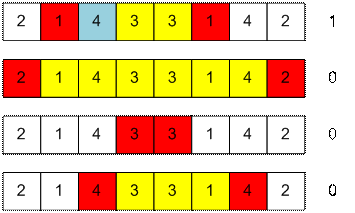 0 (количество чисел, стоящих между четверками, больших 4 и встречающихся