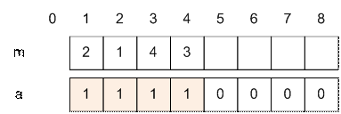 стоит в восьмой позиции. Уменьшаем a[m[2]] = a[1] на 1, после чего находим